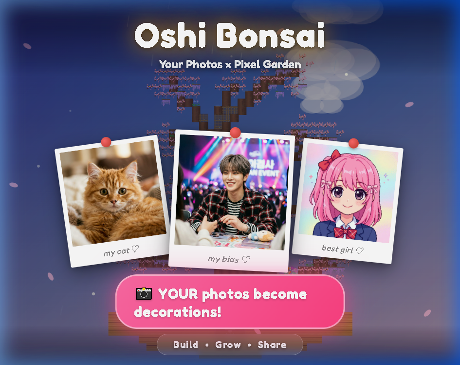 Oshi Bonsai is a cozy pixel-art garden game where you grow and decorate your own bonsai tree. The twist? You can upload your own photos — your pet, your favorite idol, anime characters, anything — and they become pixel-art decorations on your tree!